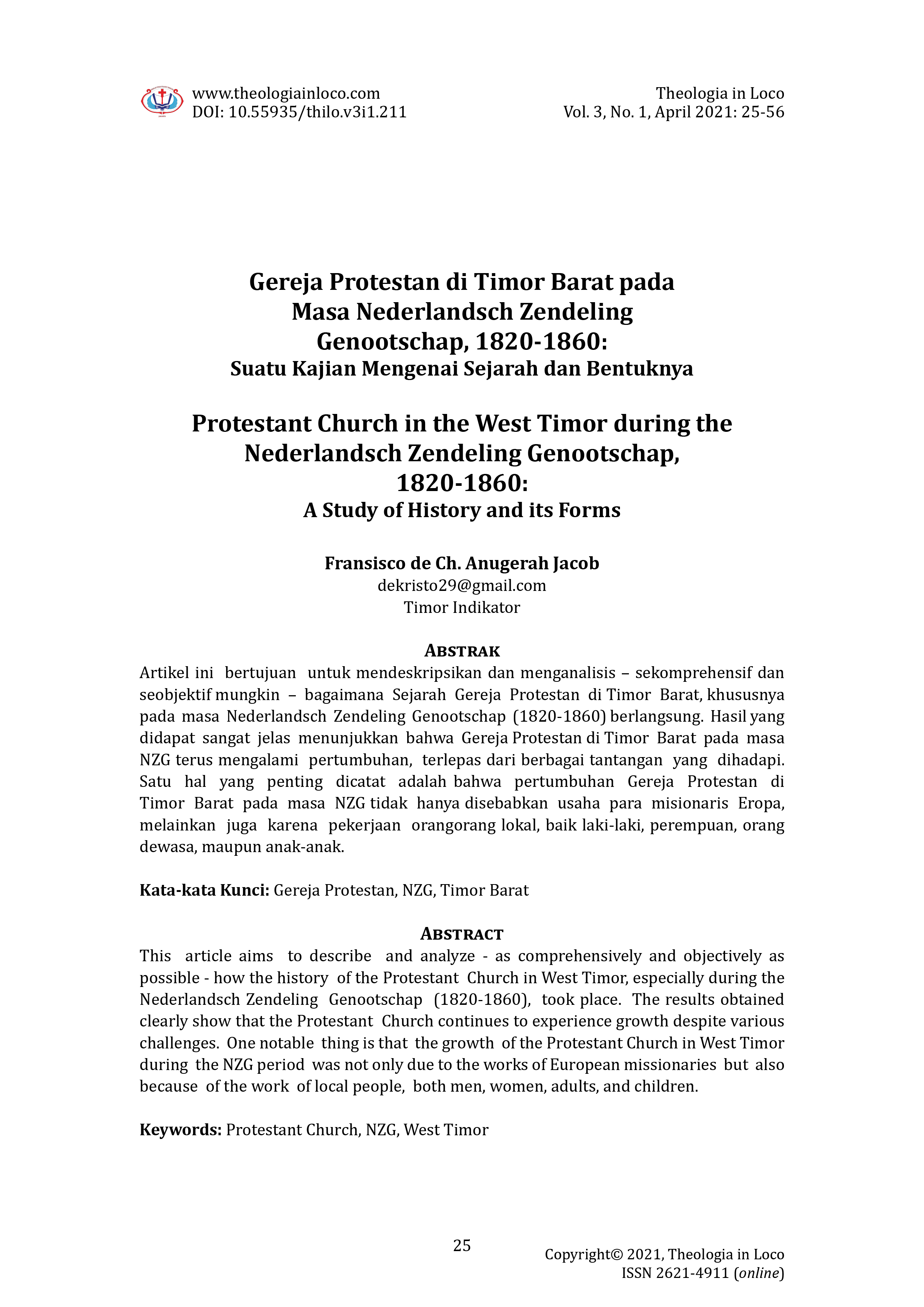 Artikel ini bertujuan untuk mendeskripsikan dan menganalisis – sekomprehensif dan seobjektif mungkin – bagaimana Sejarah Gereja Protestan di Timor Barat, khususnya pada masa Nederlandsch Zendeling Genootschap (1820-1860) berlangsung. Hasil yang didapat sangat jelas menunjukkan bahwa Gereja Protestan di Timor Barat pada masa NZG terus mengalami pertumbuhan, terlepas dari berbagai tantangan yang dihadapi. Satu hal yang penting dicatat adalah bahwa pertumbuhan Gereja Protestan di Timor Barat pada masa NZG tidak hanya disebabkan usaha para misionaris Eropa, melainkan juga karena pekerjaan orangorang lokal, baik laki-laki, perempuan, orang dewasa, maupun anak-anak.