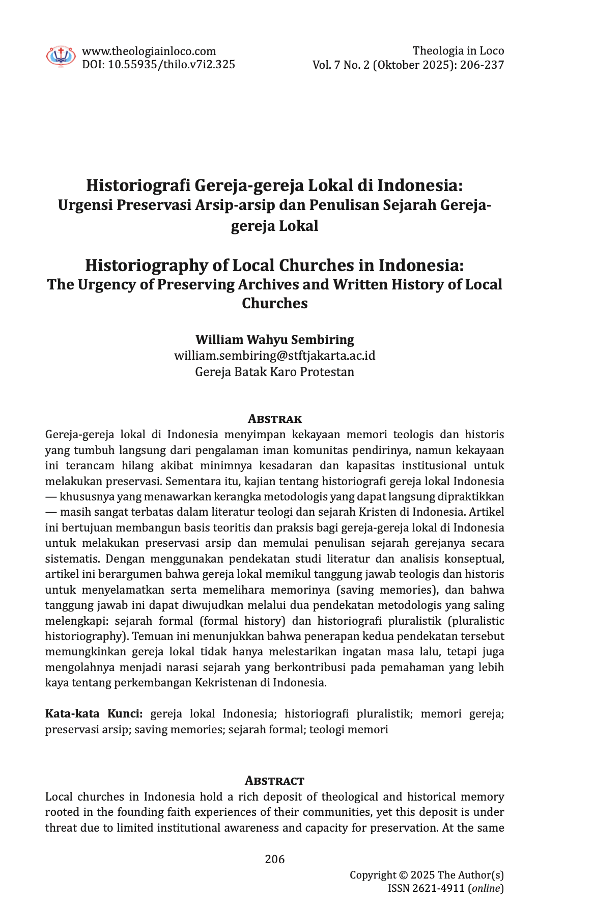 Local churches in Indonesia hold a rich deposit of theological and historical memory rooted in the founding faith experiences of their communities, yet this deposit is under threat due to limited institutional awareness and capacity for preservation. At the same time, scholarly engagement with the historiography of local Indonesian churches — particularly work that offers a directly applicable methodological framework — remains scarce in the literature of Indonesian Christian theology and history. This article aims to construct a theoretical and practical foundation for local churches in Indonesia to undertake archival preservation and begin writing their church histories in a systematic manner. Drawing on a literature review and conceptual analysis, the article argues that local churches bear a theological and historical responsibility to save and preserve their memories (saving memories), and that this responsibility can be fulfilled through two complementary methodological approaches: formal history and pluralistic historiography. These findings indicate that the application of both approaches enables local churches not only to conserve past memory but also to transform it into historical narrative that contributes to a richer understanding of the development of Christianity in Indonesia.