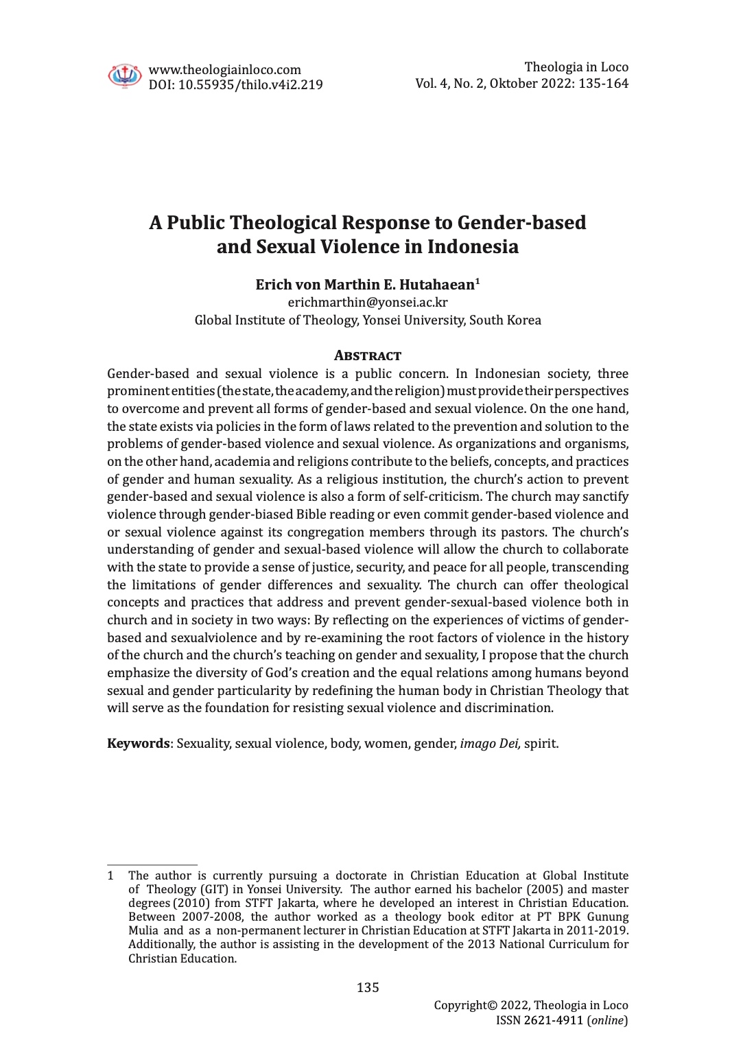 Gender-based and sexual violence is a public concern. In Indonesian society, three prominent entities (the state, the academy, and the religion) must provide their perspectives to overcome and prevent all forms of gender-based and sexual violence. On the one hand, the state exists via policies in the form of laws related to the prevention and solution to the problems of gender-based violence and sexual violence. As organizations and organisms, on the other hand, academia and religions contribute to the beliefs, concepts, and practices of gender and human sexuality. As a religious institution, the church’s action to prevent gender-based and sexual violence is also a form of self-criticism. The church may sanctify violence through gender-biased Bible reading or even commit gender-based violence and or sexual violence against its congregation members through its pastors. The church’s understanding of gender and sexual-based violence will allow the church to collaborate with the state to provide a sense of justice, security, and peace for all people, transcending the limitations of gender differences and sexuality. The church can offer theological concepts and practices that address and prevent gender-sexual-based violence both in church and in society in two ways: By reflecting on the experiences of victims of gender-based and sexual violence and by re-examining the root factors of violence in the history of the church and the church’s teaching on gender and sexuality, I propose that the church emphasize the diversity of God’s creation and the equal relations among humans beyond sexual and gender particularity by redefining the human body in Christian Theology that will serve as the foundation for resisting sexual violence and discrimination.