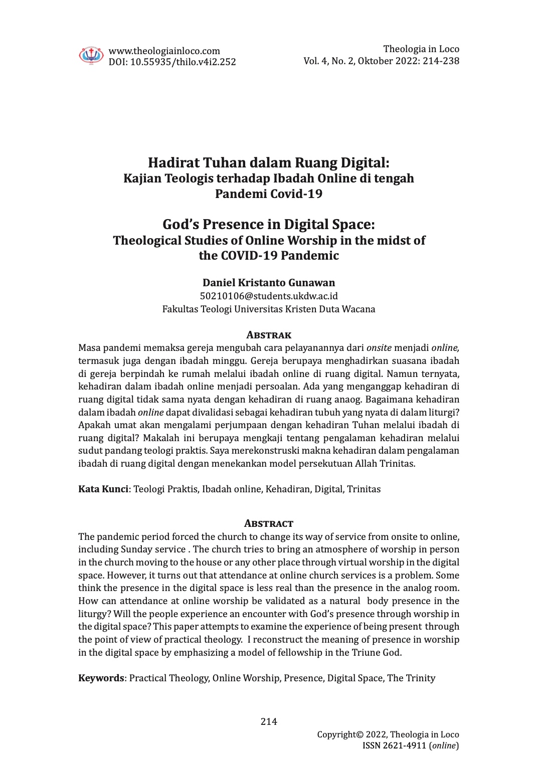 The author retains copyright and also agrees to grant Theologia in Loco the right of first publication with the work simultaneously licensed under CC Attribution-NonCommercial-ShareAlike 4.0.