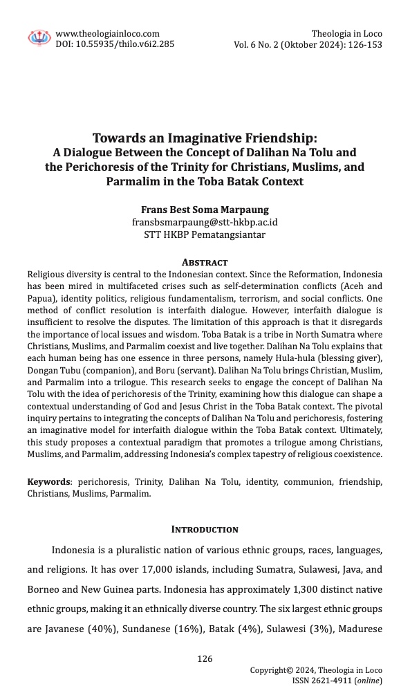 Religious diversity is central to the Indonesian context. Since the Reformation, Indonesia has been mired in multifaceted crises such as self-determination conflicts (Aceh and Papua), identity politics, religious fundamentalism, terrorism, and social conflicts. One method of conflict resolution is interfaith dialogue. However, interfaith dialogue is insufficient to resolve the disputes. The limitation of this approach is that it disregards the importance of local issues and wisdom. Toba Batak is a tribe in North Sumatra where Christians, Muslims, and Parmalim coexist and live together. Dalihan Na Tolu explains that each human being has one essence in three persons, namely Hula-hula (blessing giver), Dongan Tubu (companion), and Boru (servant). Dalihan Na Tolu brings Christian, Muslim, and Parmalim into a trilogue. This research seeks to engage the concept of Dalihan Na Tolu with the idea of perichoresis of the Trinity, examining how this dialogue can shape a contextual understanding of God and Jesus Christ in the Toba Batak context. The pivotal inquiry pertains to integrating the concepts of Dalihan Na Tolu and perichoresis, fostering an imaginative model for interfaith dialogue within the Toba Batak context. Ultimately, this study proposes a contextual paradigm that promotes a trilogue among Christians, Muslims, and Parmalim, addressing Indonesia's complex tapestry of religious coexistence.
